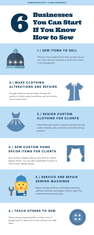 The best part about a clothing alterations and repairs business is that most projects won’t take much time to complete because you’re not starting a sewing project from scratch. That means it’s an easy way to churn a profit. For example, you can easily let out a pair of pants or hem a dress in 15 minutes or less and charge $20+ for the service.