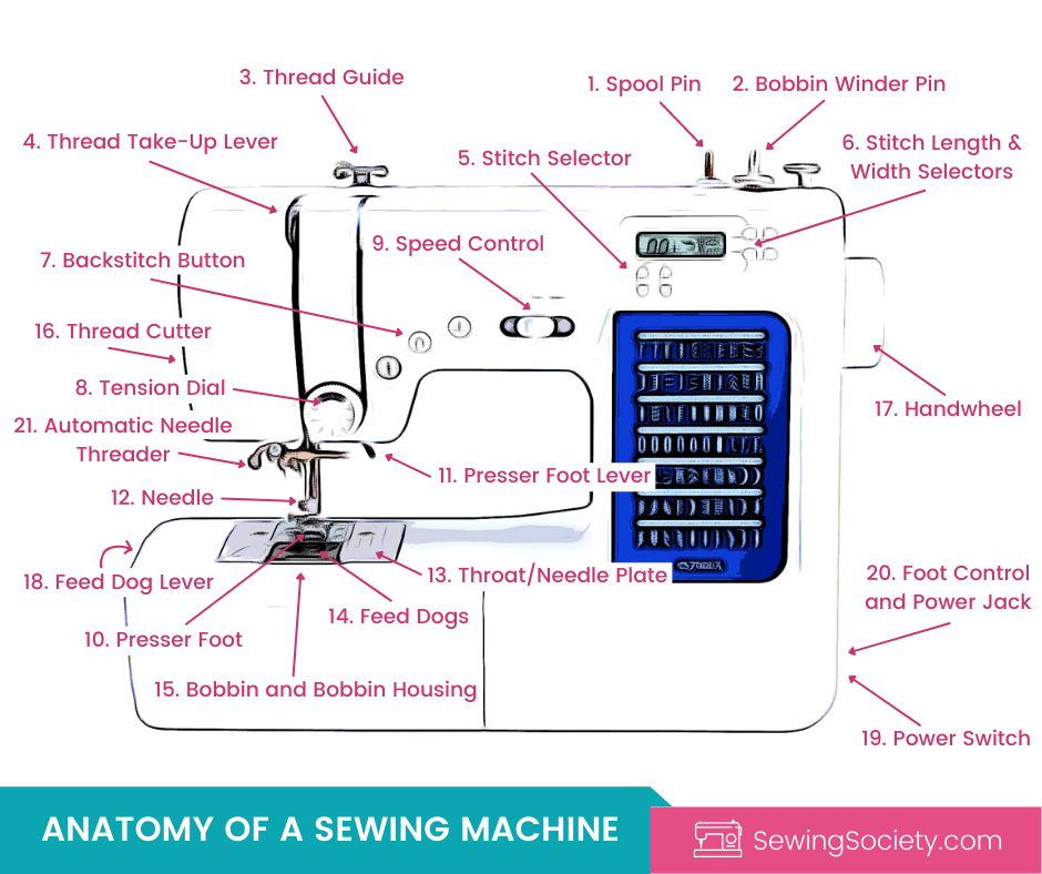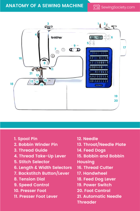 If you’ve never used a sewing machine before, the first thing you need to learn is all the parts and their functions. That’s what this post is all about — I’m going to walk you through the anatomy of a sewing machine from top to bottom.