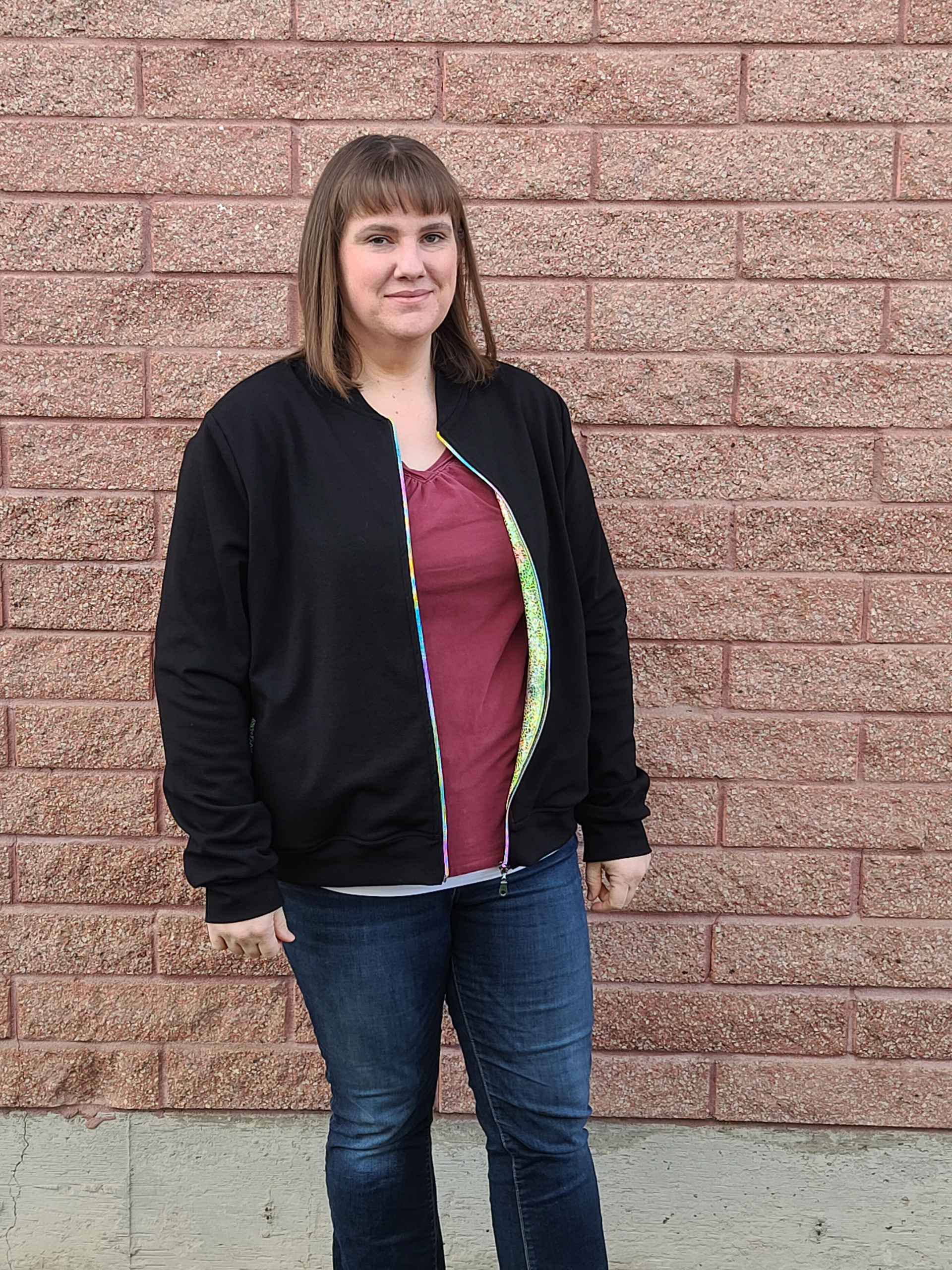 I like the way my Ollie Bomber turned out, but it was a little big for me. I followed the measurements on the pattern, so if you’re in between sizes, it’s fine to choose the smaller size on this one. The Ollie Bomber is roomy in the waist area. I know bomber jackets are not very long, but I wish I would have added some length to my jacket because of personal preference.