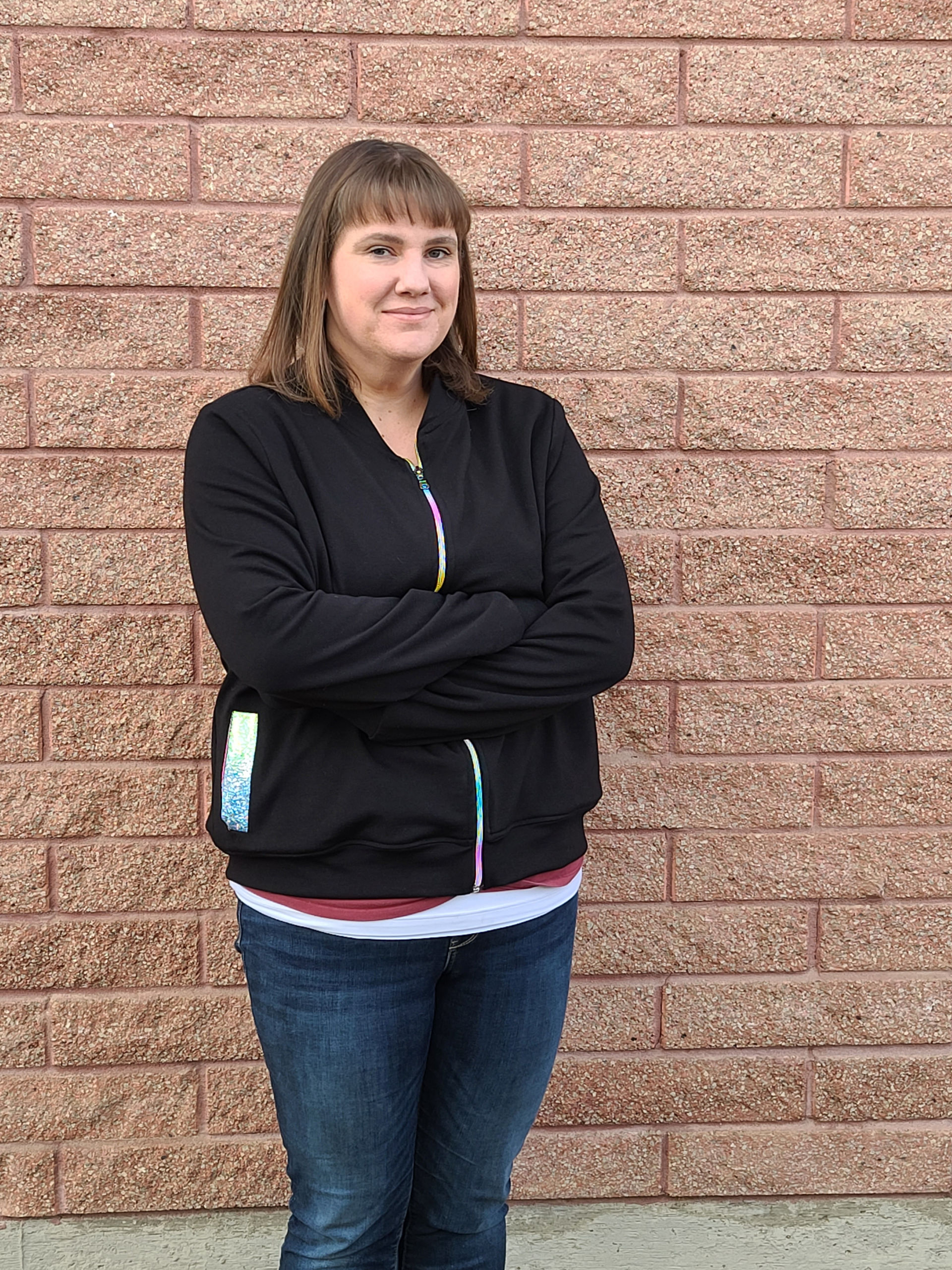 ThreadCrate included some amazing black, ponte knit fabric for the jacket, as well as two zipper options. I went with the bold rainbow zipper for my bomber jacket! I also bought some fun rainbow knit for the lining. I love how my Ollie Bomber turned out! Check out these pics of me wearing it: